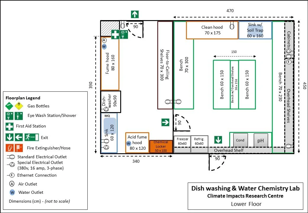 Dish washing and Water Chemistry Lab, 13 and 21 sqm. Dish washing room with fume hood and acid fume hood, a ventilated chemical locker, shelves, dishwasher and sink. Water Chemistry Lab with clean hood, freezer and refrigerator, sink with soil trap and several work benches. A bench with pH and conductivity meters intended for cleaner water samples. No samples of soil/water mixtures may be analyzed here, the ANS chemistry lab has adequate equipment for that.